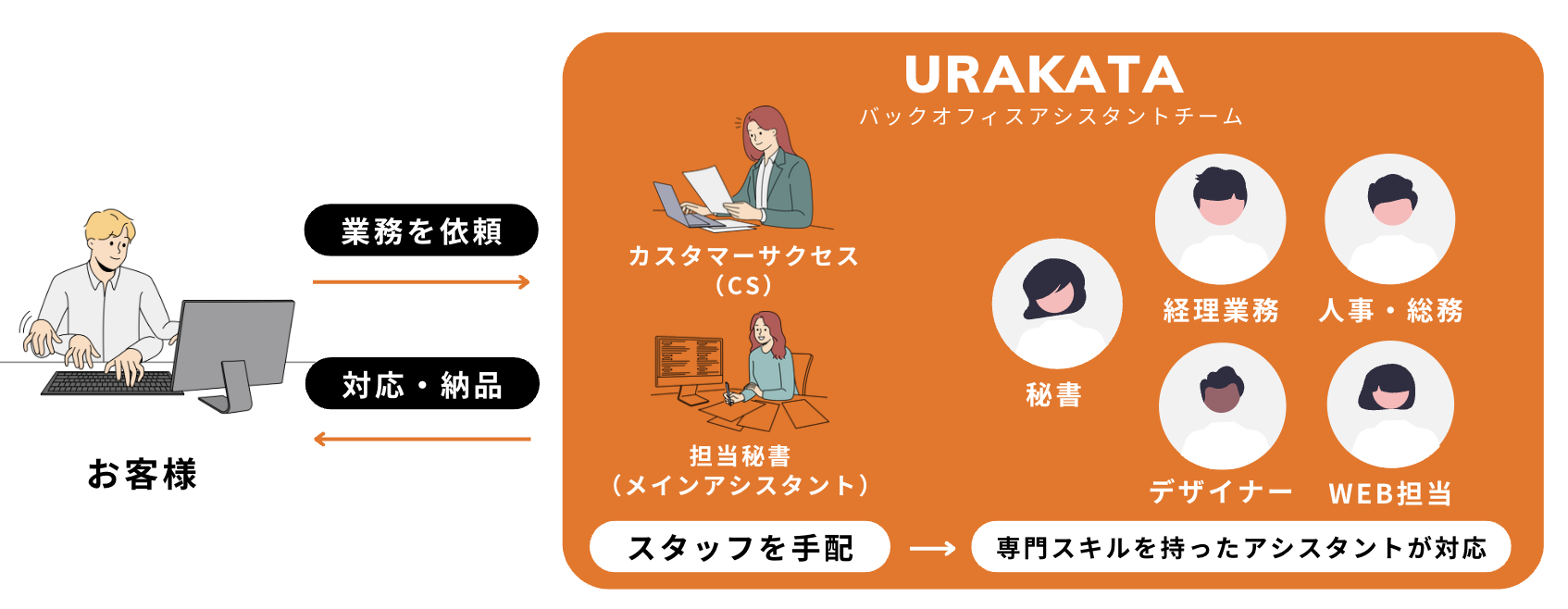 従来の個人雇用では、担当者が休んだら業務ストップ、退職したら一からやり直し。URAKATAは複数名のチームで対応するため、標準化されたワークフローで一定品質を保証し、面倒な引き継ぎも不要です。